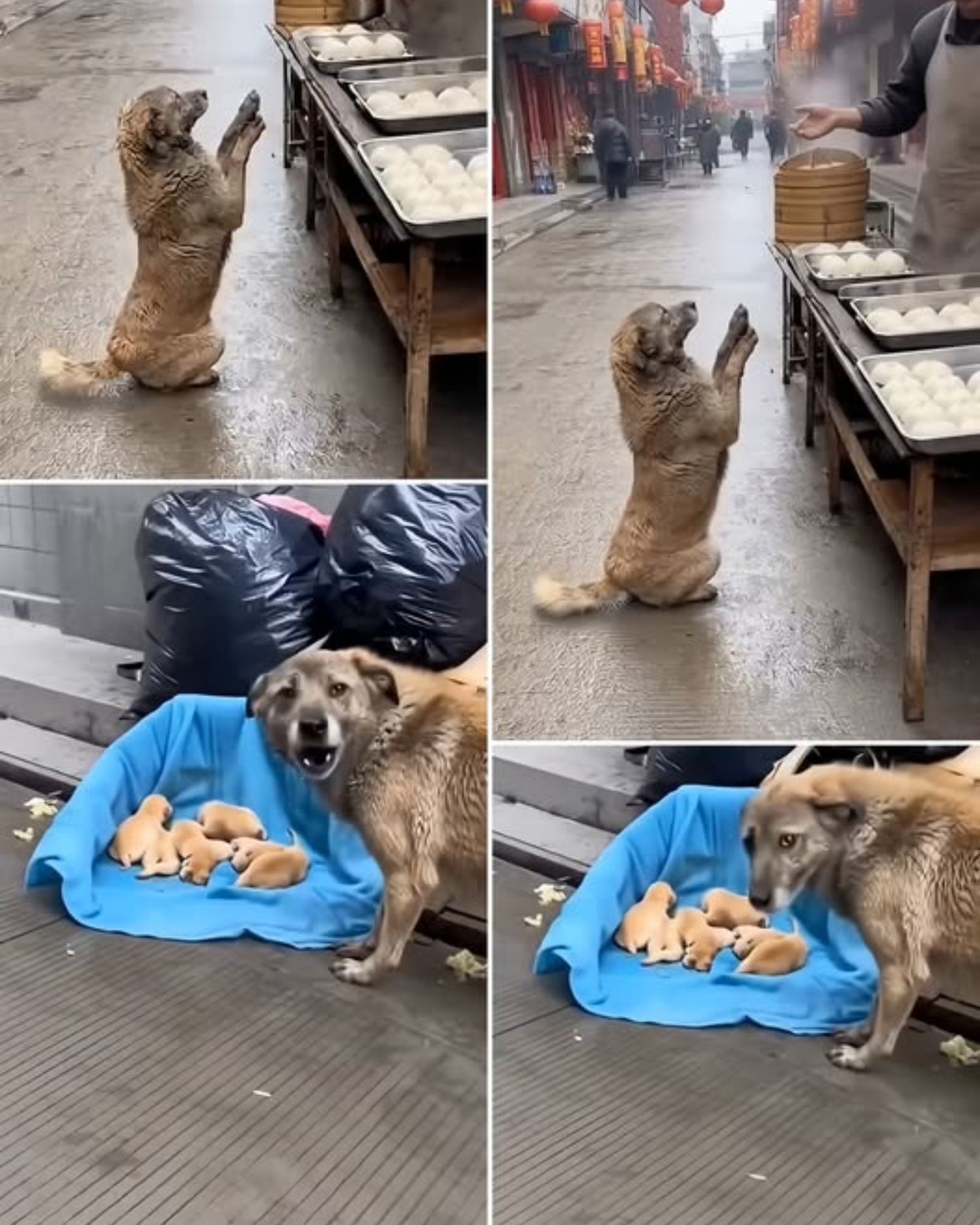 Vecinos cercanos compartieron que habían visto a la perra vagando bajo la lluvia muchas veces, con una frágil esperanza en sus manos, y sus ojos llenos de tristeza y agotamiento. “Al ver esa escena, sentí un nudo en el estómago. Buscaba cada trozo de comida, cada gota de agua, solo para que sus cachorros no murieran de hambre”, relató un residente conmovido. Esta imagen se compartió de inmediato en redes sociales, provocando que la comunidad en línea rompiera a llorar y sintiera lástima.