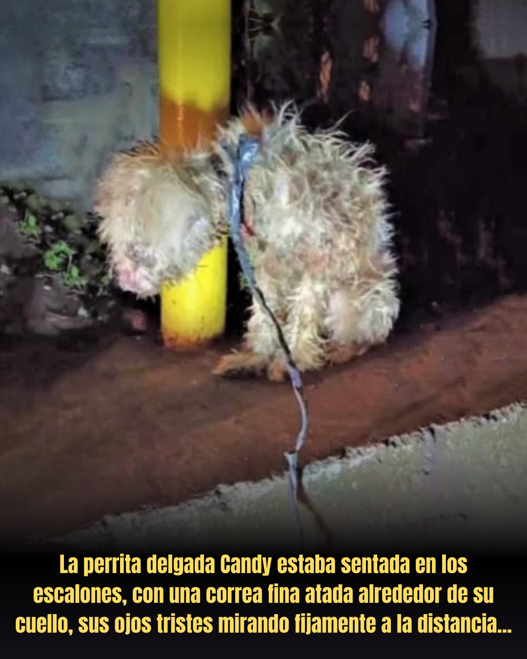 En un rincón familiar del tranquilo pueblo de un valle en Asturias, Candy, la perrita mestiza pequeña, se sentaba tranquilamente en las escaleras de una casa abandonada, con una fina cuerda atada al cuello que la mantenía en ese lugar. No ladraba ni se resistía; solo miraba fijamente el camino lejano, con las orejas alerta al oír pasos o un coche acercándose. Día tras día, su pequeño cuerpo adelgazaba por el hambre y la sed, su pelaje se volvía opaco y sucio por la lluvia y el polvo, pero sus ojos aún brillaban con un tenue rayo de esperanza, esperando pacientemente a su dueña que se había ido prometiendo volver. Esa lealtad inquebrantable hacía doler el corazón de todos los vecinos que la veían desde lejos, en la fría soledad que la envolvía.
